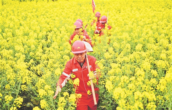 阳春三月,川南丘陵被金黄的油菜花拥抱。青翠山峦间,一支支身着红色工装的找油找气队伍在春日暖阳下奔向崇山峻岭。这是由东方物探西南分公司承担施工的2023年首个鸣炮采集的页岩气三维勘探项目。民爆工程中心三队500余名施工人员、上百个施工班组和作业单元紧盯安全升级、质量过硬、作业规范和清洁环保四方面要求开展野外生产。