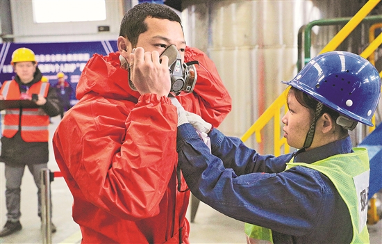 3月15日,在位于河北省秦皇岛市海港区的秦皇岛博赫科技开发有限公司内,参赛选手正在进行职业危害排查与检测考核赛项中的穿戴防化服比赛。