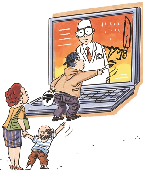 “网络医闹”本质上是网络暴力,相关不实信息和抹黑言论,不仅会对医院和医务工作者造成名誉、声誉上的侵犯,而且会对医务工作者的精神和心理造成伤害。医生和患者间本应多一些理解和配合,在网上侮辱、诋毁医生,无助于优化就诊体验,还可能激化矛盾。更可怕的是,一些人实施网络医闹行为,为的就是博眼球、赚流量。尊医重卫、和谐医患,是应该持续努力的方向,网络不该成为医闹的第二战场,打着监督和维权的幌子绑架医疗事业的行为,更不能被纵容。 赵春青/图 弓长/文