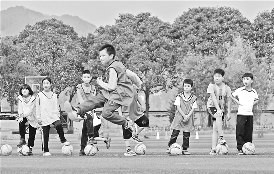 3月15日,学生们在上塘镇中心小学足球场进行射门训练。