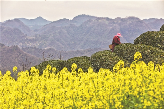 3月17日,在陕西省勉县阜川镇小河庙茶山 ,村民在采茶。近年来,勉县构建“特色农业+茶乡旅居+油菜花海”的农旅融合产业体系,让“花”“茶”经济成为秦巴山区发展新引擎。