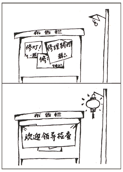 故事发生于一个很普通的街巷,起因于这条小街路灯失去了应有的功能。而广大群众显然已经习惯了有光的生活,于是开始反映问题,不断反映问题,持续要求解决问题。遗憾的是,群众反映的问题迟迟得不到解决。看,本是体现上情下达的布告栏,像放大了的总结材料,详实地记录了这些真实的事情。