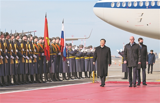 俄方在机场举行隆重迎宾仪式。军乐团奏中俄两国国歌。习近平检阅俄罗斯三军仪仗队并观看分列式。