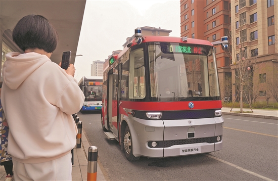 3月20日,智能网联巴士901线测试车在河北雄安新区容东片区道路上停靠。
