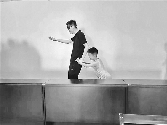 在一次EAP亲子关系团体心理辅导中,孩子扶着戴着眼罩的父亲往前走。