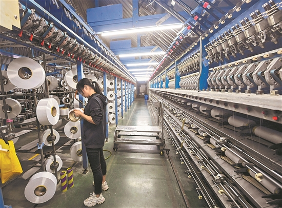 3月21日,诸暨市安华镇工业园区一家企业的数字化车间内,自动化生产设备在生产高品质锦纶弹力丝。