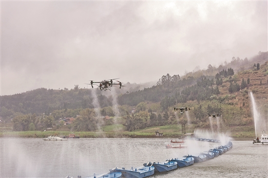 3月23日,在重庆市铜梁区高楼镇涪江流域突发水污染事件应急联合演练现场,工作人员运用无人机、水上雾炮船等设备模拟向江面抛洒重金属捕捉剂。