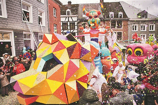 近日,在比利时东部小城斯塔沃洛举行的狂欢节游行上,表演者向人们抛洒碎纸片。