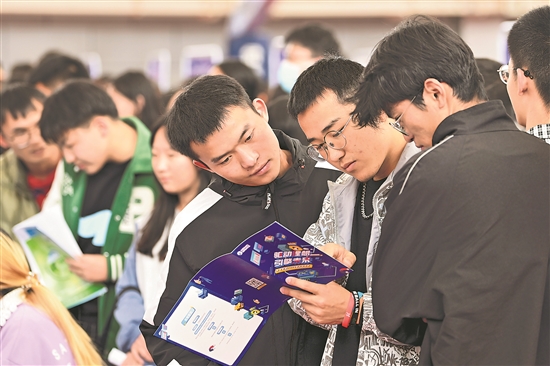 3月26日,甘肃省兰州市,由人力资源和社会保障部全国人才流动中心与甘肃省人力资源和社会保障厅主办的“2023年全国大中城市巡回招聘甘肃站——西北民族大学校园招聘会”在西北民族大学(榆中校区)举行。图为求职者了解用工企业岗位信息。九美旦增 摄/中新社