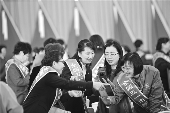 3月24日,全国五一巾帼奖表彰大会后,获奖者代表分享喜悦。本报记者 刘金梦 摄