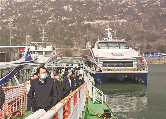 3月27日,在青岛崂山太清游船码头,游客下船准备游览崂山。