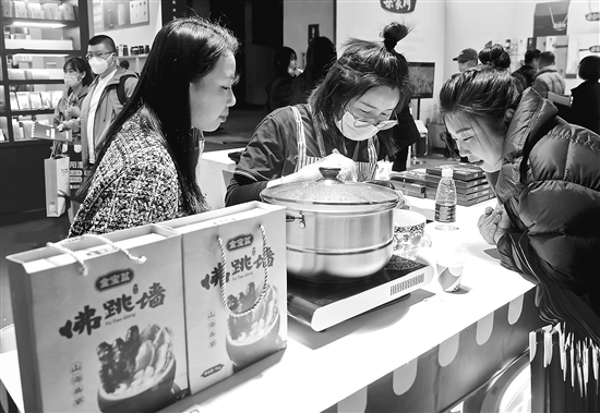 3月24日,观众在展会上等待品尝预制菜“佛跳墙”。正在北京举行的第47届中国北京国际礼品、赠品及家庭用品展览会,覆盖了超过20个大类的消费品类,展出定制礼品、商务礼赠品、节庆礼品等适用不同场景的数十万款好物。