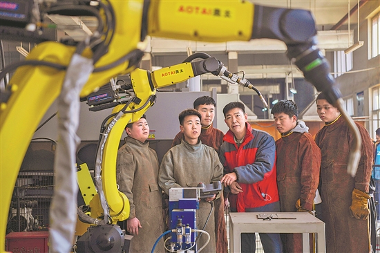 3月28日,在河北省兴隆县职教中心,学生在进行机器人焊接实训。