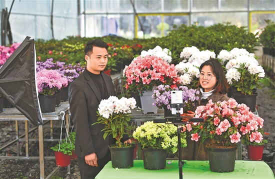 3月28日,在贵州省毕节市百里杜鹃管理区汇境花卉基地,当地宣传工作志愿者和花卉基地工作人员在直播推荐花卉。