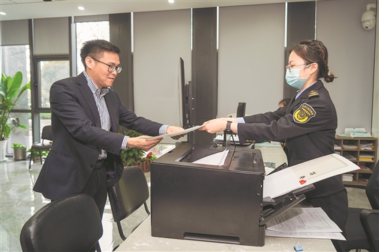 3月30日,在南京市雨花台区市场监管局雨花分局,江苏省第1000万户个体工商户张康(左)领取个体工商户营业执照。