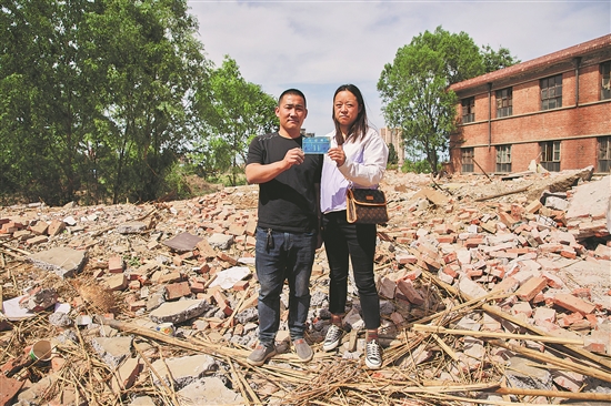 2021年5月8日,安新县白洋淀旁,听说老房已拆,王二猛(图左)和妻子又特地回去,在废墟中找到了老房的门牌。