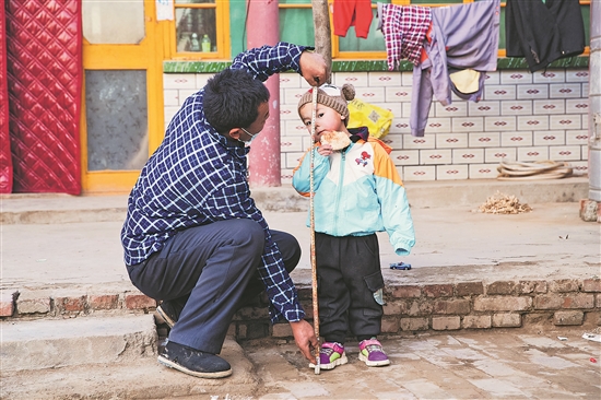 2020年12月3日,王福军(图左)正在自家的小院里给王雄安测量身高。