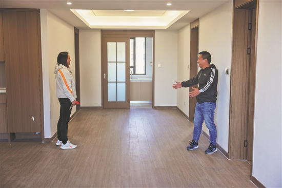 3月27日,容西片区首批安置房内,王二猛(图右)正和妻子商量新房的装修和家具的摆放。