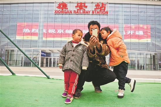 2020年12月28日,雄安高铁站投入运营后,王福军(图中)带着王雄安(左一)和女儿来参观,并在站前广场合影。