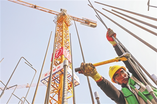 3月29日,河北雄安新区,由中铁十二局承建的雄东片区B单元安置房项目施工现场,来自云南的钢筋工罗金保正在用套丝连接钢筋。该项目建成后将迎来2075户雄安居民。