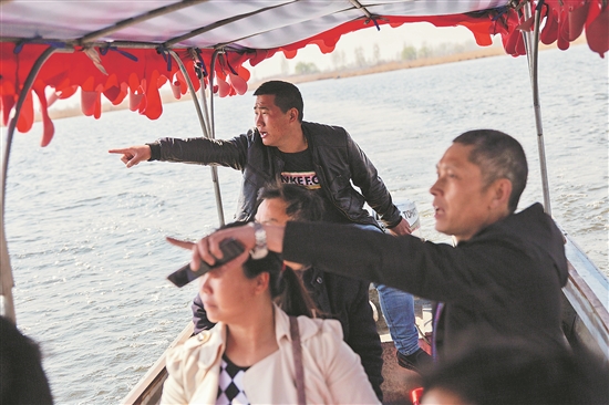 2019年4月2日,长年靠白洋淀为生的王二猛带着游客参观白洋淀景区。