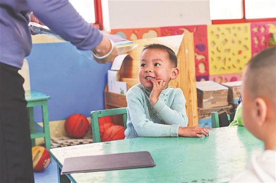 3月31日,雄县米家务镇板东幼儿园,王雄安正跟着老师上手工课。