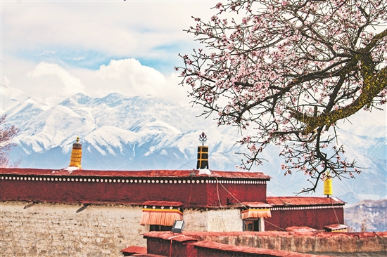 近日,位于拉萨北部山坳里的古刹帕邦喀周围桃花盛开,吸引众多游客前来观光拍照。新华社记者 孙非 摄