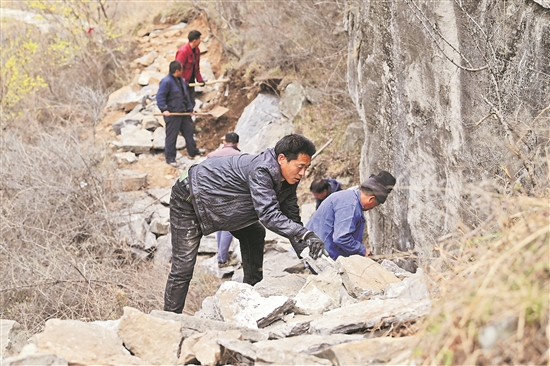 3月23日,在山西省壶关县大峡谷镇青龙峡村,牛何松(前)和村民们在山上修路。