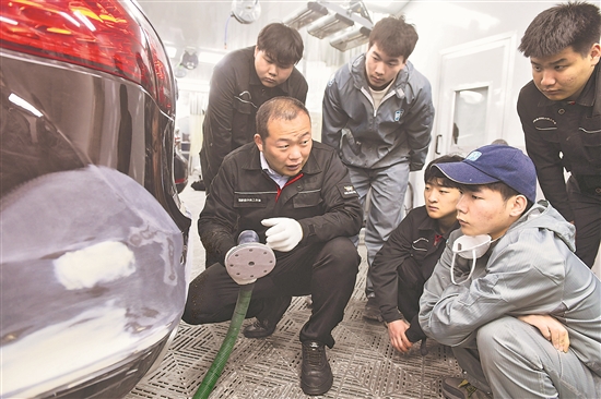 4月3日,安徽阜阳技师学院国家级技能大师、全国人大代表贾亮(前左一)在汽车涂装车间向学生传授汽车喷漆前处理知识。近年来,该学院结合就业市场的需求,探索“校长围绕厂长转、专业围绕产业转,教学围绕生产转,学校像工厂、教室像车间、老师像师傅、学生像徒弟”的“三转四像”校企合作办学模式,走出一条高技能人才培养新道路。王彪 摄/人民图片