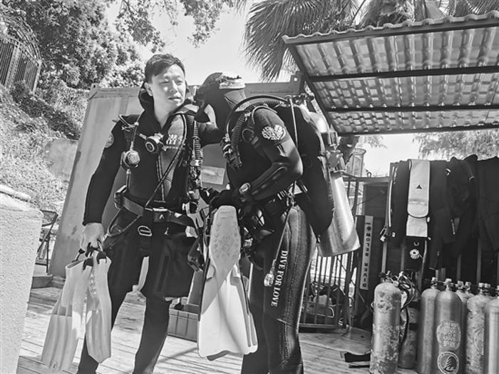 下水作业前,曾玉霞和潜伴张缪成互相检查潜水装备。本报记者 刘友婷 摄