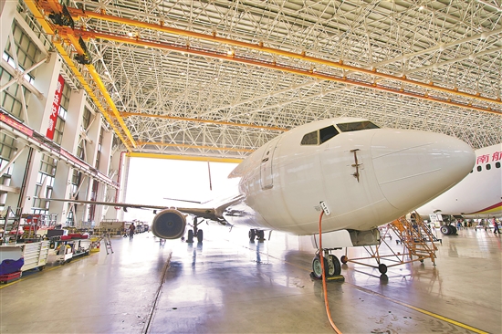 3月31日,在海南自贸港一站式飞机维修产业基地内,进境飞机接受飞机发动机、应急设备等多项检修项目。
