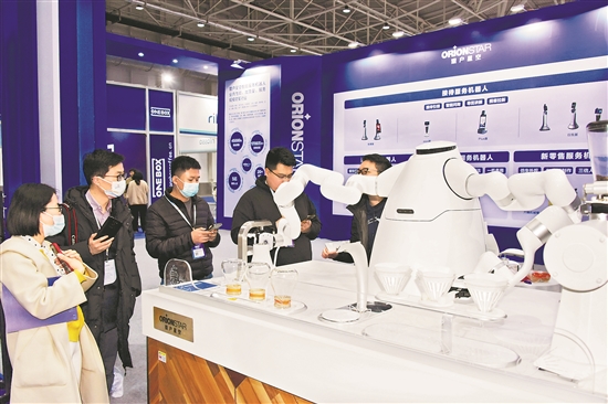 4月6日,参观者在展会上观看接待服务机器人。