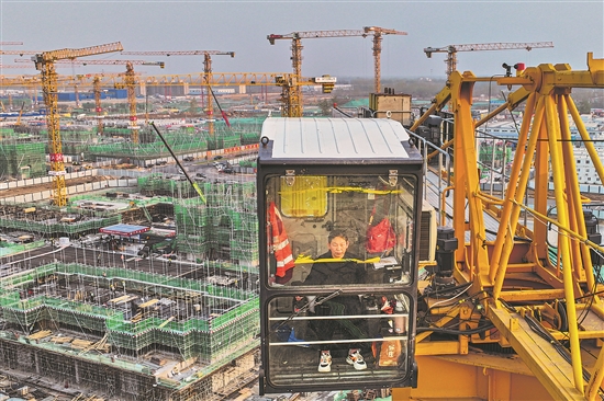 3月29日,河北雄安新区,在雄东片区的工地上,女塔吊司机刘建华正在操作室内工作。在雄安新区有不少像刘建华这样的女塔司,默默为新区建设奉献着自己的力量。无论夏日酷暑还是寒冬腊月,只要天气状况符合施工要求,塔司就要出现在自己的岗位上,确保工程顺利进行。为此,她们每天需要攀爬数十米甚至上百米的钢梯才能到达驾驶室。在这不足2平方米的空间内,往往一待就是四五个小时,她们在此期间需要保持精神高度集中,从而才能精准操作吊机,将各种建材运送到指定位置。本报记者 王伟伟 摄