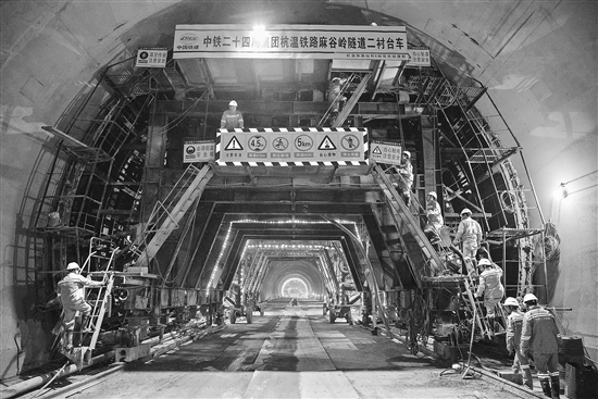 4月3日,工人登上杭温铁路麻谷岭隧道二衬台车进行施工作业。当日凌晨,麻谷岭隧道全线贯通。杭温铁路设计时速350公里,建成后将增强区域干线高速铁路网,构建浙江省“1小时交通圈”。新华社记者 江汉 摄