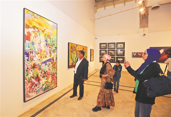 当地时间4月3日,“艺汇丝路——中阿知名艺术家采风作品展”暨中阿艺术家对话沙龙活动在埃及开罗举行。图为人们在开罗参观展览。新华社记者 隋先凯 摄