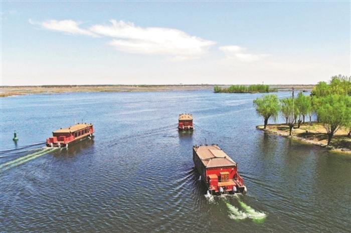 4月7日,处于试运营阶段的白洋淀“水上巴士”项目画舫船在白洋淀内行驶。由北京公交集团运营的白洋淀“水上巴士”项目将于近日正式开通运营。“水上巴士”项目还开设生态木船游,让游客在芦苇荡中泛舟,享受人与自然的和谐之美。本报记者 王伟伟 摄