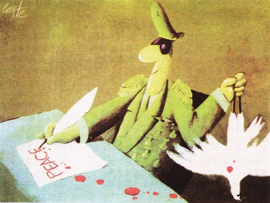 嗜血的战争狂人不惜置人民于苦难中,一手猖狂地侵略扩张,另一手玩弄“和平”伎俩,卑劣嘴脸昭然若揭,谁相信刽子手的谎言呢!
