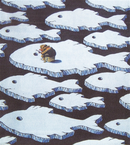 钓鱼的先生在冰上专心的垂钓,他没有感觉到周围在浮动,更没想到已陷入岌岌可危的险境。这里还得旧话重提:安全第一。