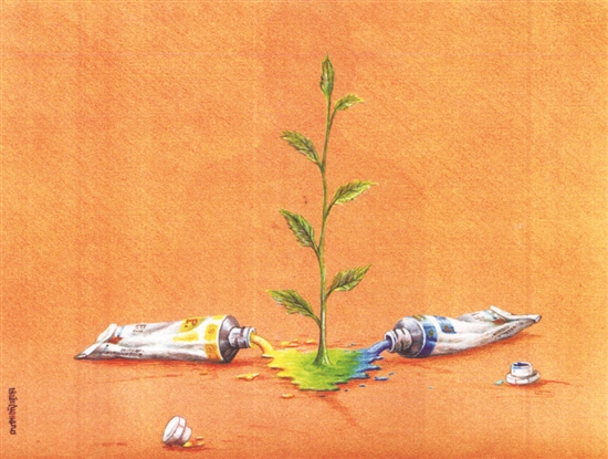 当下环境恶化,植被和水系面积萎缩,人们对绿色格外珍惜,三原色中的黄和蓝受到青睐——绿色新生圆了环保之梦。