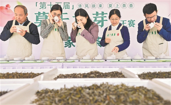 当日,德清县第十五届“莫干黄芽”茶王赛在莫干山镇庾村广场举行。茶农们带来47个茶样参加比赛,茶叶感官审评专家和大众评审团根据茶叶的外形、滋味、香气、汤色和叶底等指标进行评选。“莫干黄芽”茶王赛自2003年开始举办,旨在弘扬“莫干黄芽”茶传统文化,传承农业文化遗产和非物质文化遗产。本报通讯员 谢尚国 摄