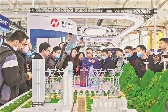4月7日,在北京首钢会展中心举办的第十一届储能国际峰会暨展览会上,讲解员向采购商们介绍新型储能沙盘模型。据了解,当前中国新型储能呈现高速发展之势。去年,中国新型储能新增规模达7.3 GW/15.9 GWh,创历史新高,功率规模同比增长两倍,能量规模同比增长2.8倍,位居世界前列。本报记者 蔚可任 摄
