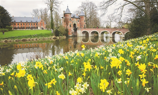 这是当地时间4月7日在比利时首都布鲁塞尔以西的拜加登城堡园林拍摄的花卉。