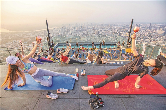 当地时间4月8日,在泰国曼谷王权云顶大厦顶层观景平台,数十名瑜伽爱好者体验高空瑜伽。新华社记者 王腾 摄