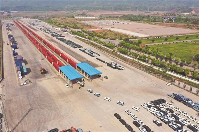 图为4月10日,商品车在重庆鱼嘴站等待装车。