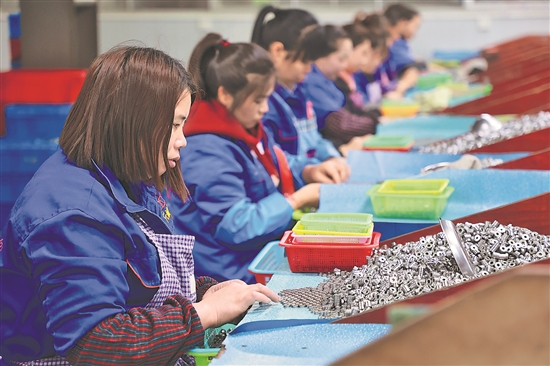 4月10日,搬迁群众在贵州省独山县望城社区安置点附近的轴承产业园区内检查成品轴承质量。近年来,该县大力发展轴承产业,将产业园区落位于当地易地扶贫搬迁安置点附近,带动了搬迁群众就业。新华社记者 刘续 摄