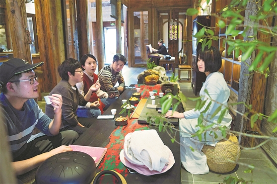 4月9日,在黟县碧阳镇石亭村的民宿拾庭画驿,游客在品尝徽式茶点。