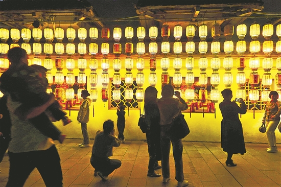 4月10日晚,江西省南昌市,游客们在滕王阁的灯笼墙前拍照。春暖花开时节,南昌迎来旅游旺季。夜色下的英雄城灯光璀璨,“一江两岸”灯光秀带来多彩夜景,美不胜收。