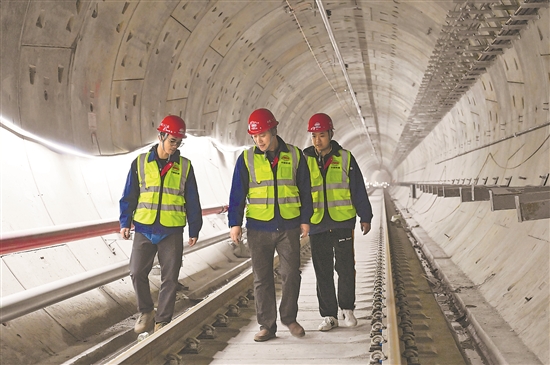 图为4月11日,中铁二十二局集团几名技术人员在检查盾构区间施工质量。