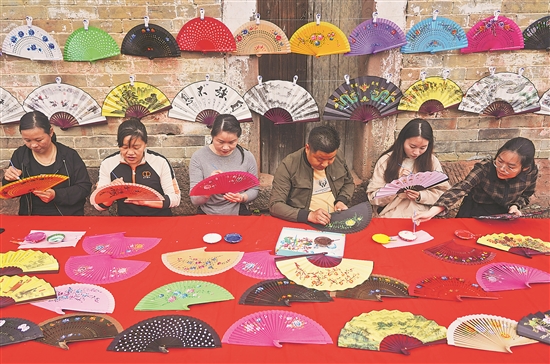 4月12日,在江西省广昌县甘竹镇罗家村,村民在绘制工艺扇。