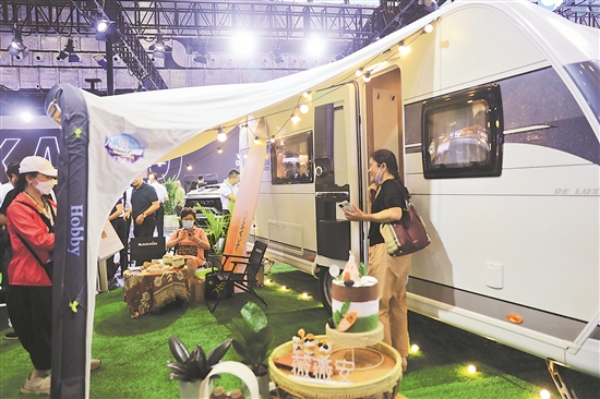在消博会上,房车搭配露营场景的展示引来游客围观。本报记者 北梦原 摄